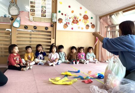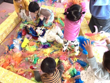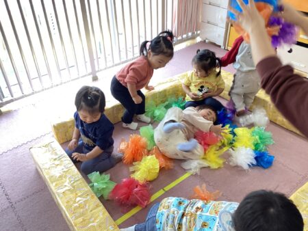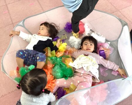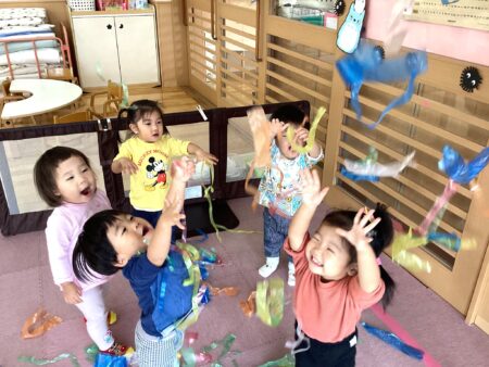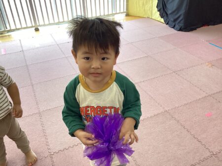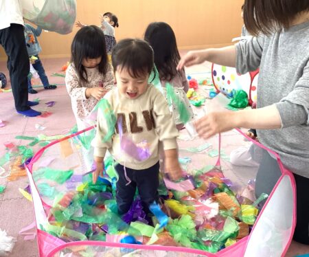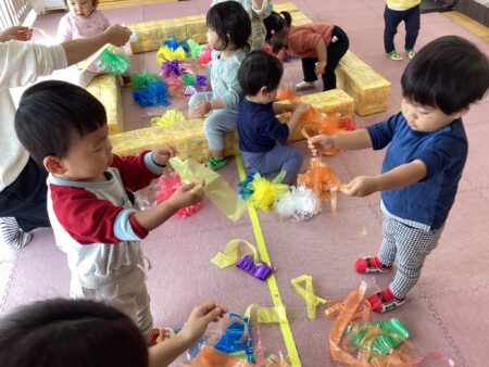 カシャカシャとした感触を味わったり、すずらんテープを「わぁ~✨」と上から降らせて、すずらんテープのシャワーを浴びたり、ビリビリとさくことにも挑戦しました😆🎵