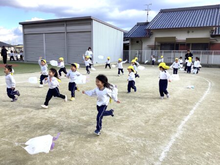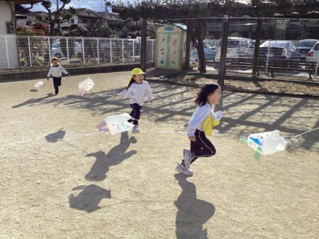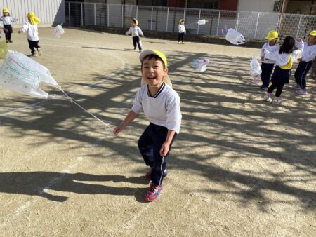 風を感じながら走り、自分で作った凧が揚がる様子に大喜びの子どもたちは、ニコニコでたくさん運動場を走っていました✨