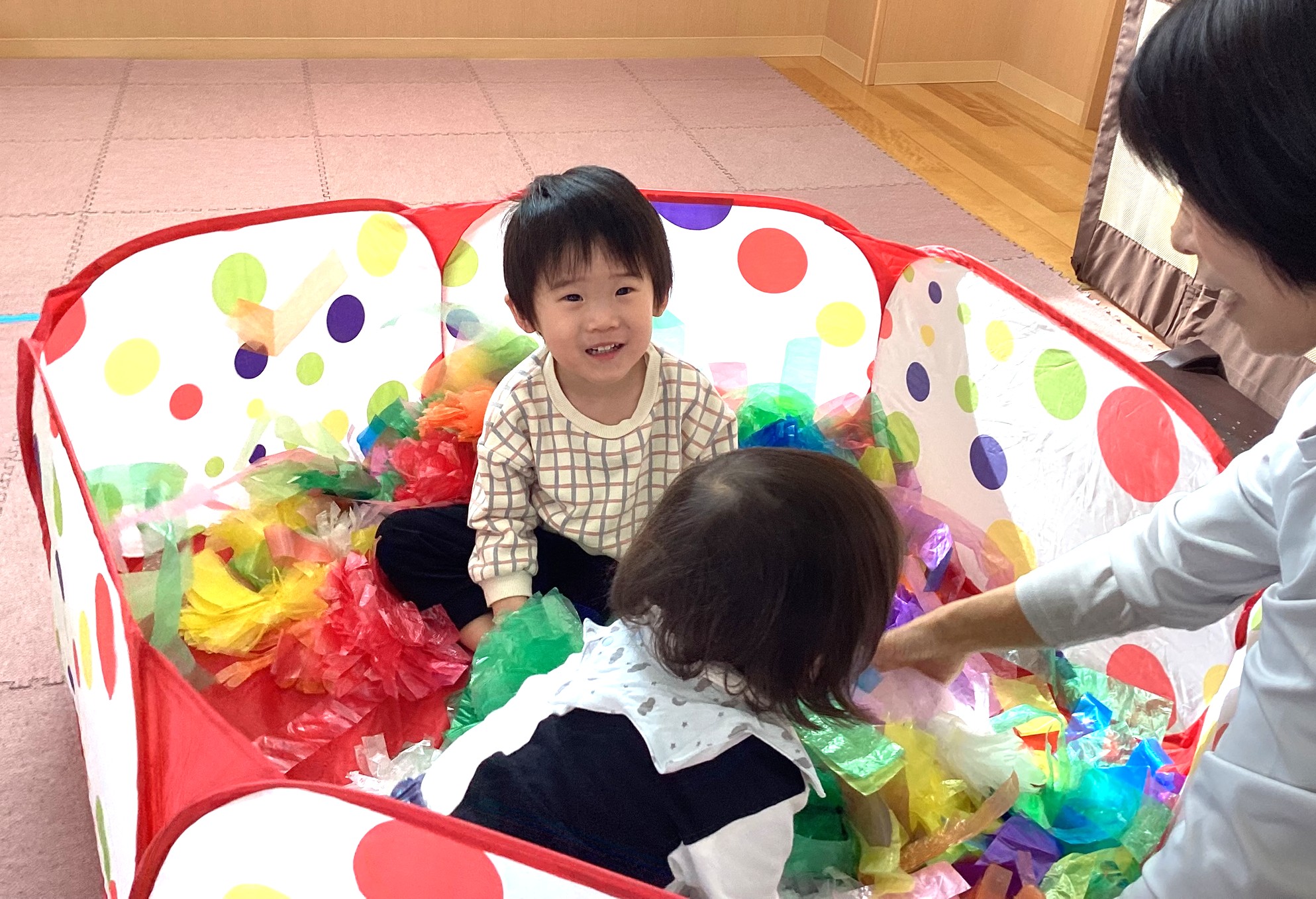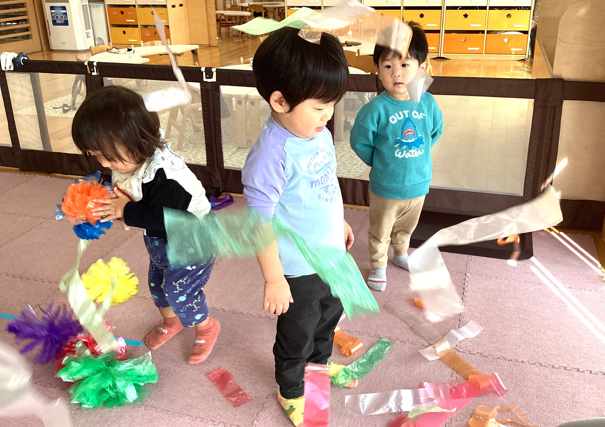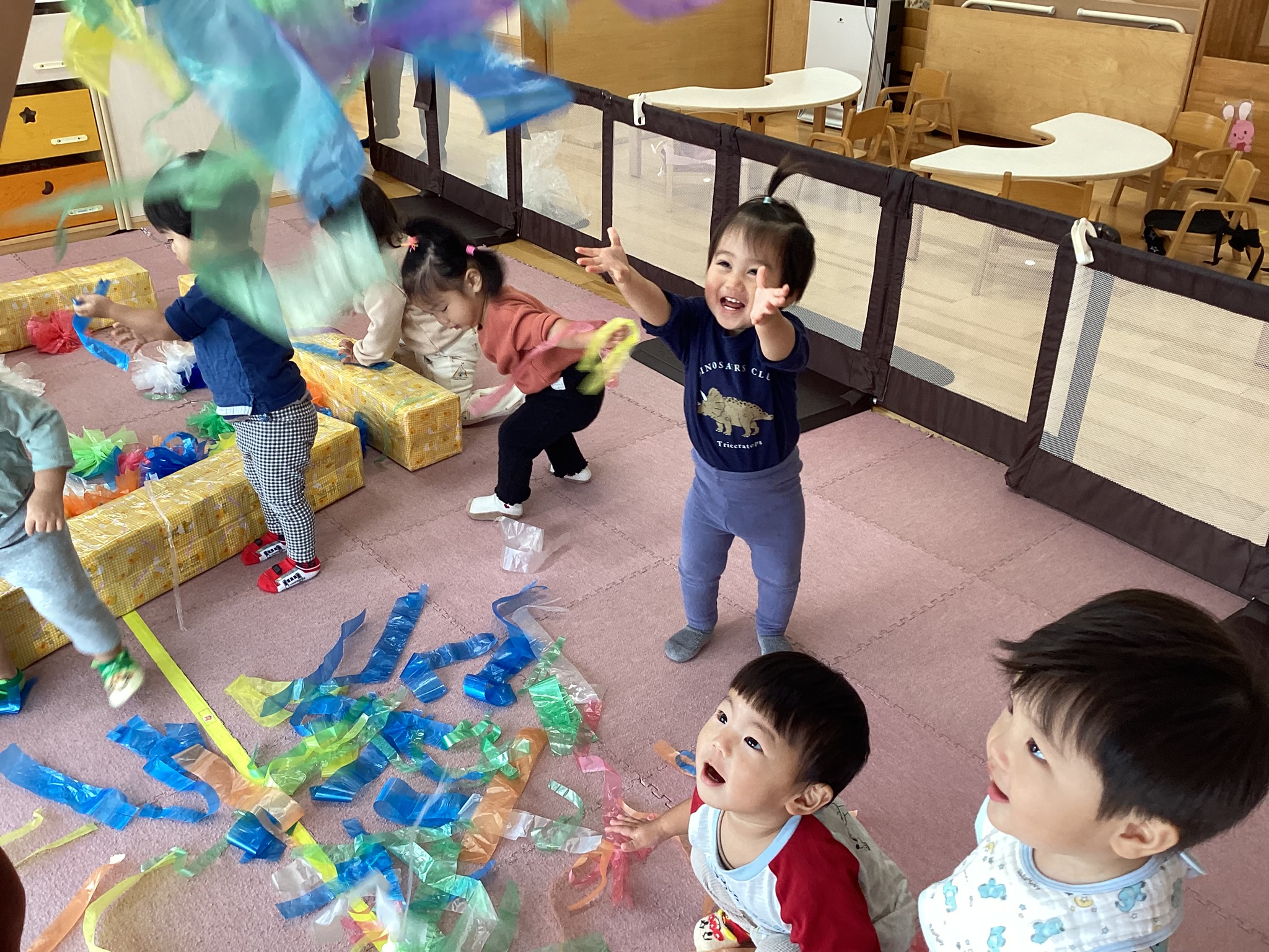 カシャカシャとした感触を味わったり、すずらんテープを「わぁ~✨」と上から降らせて、すずらんテープのシャワーを浴びたり、ビリビリとさくことにも挑戦しました😆🎵