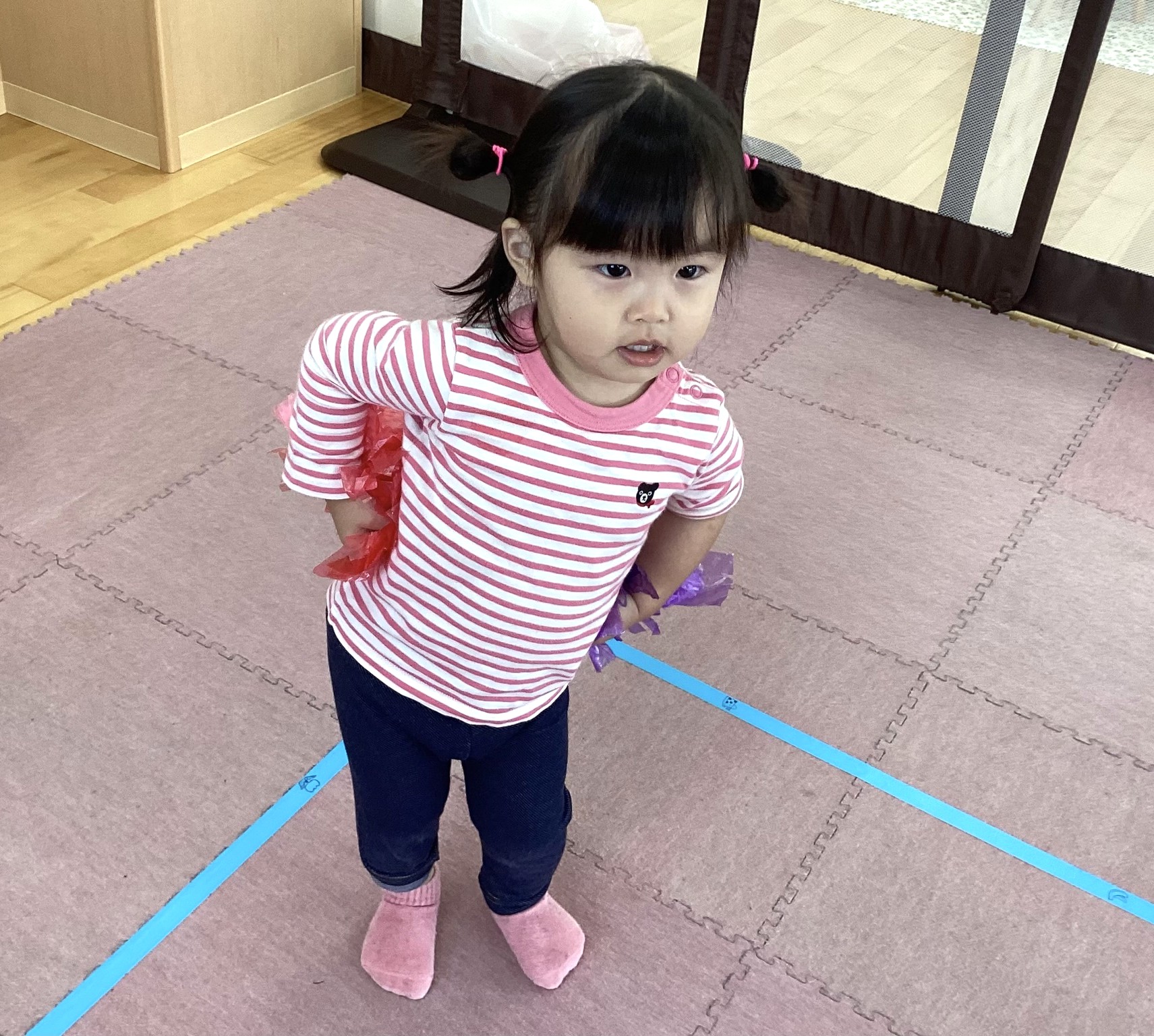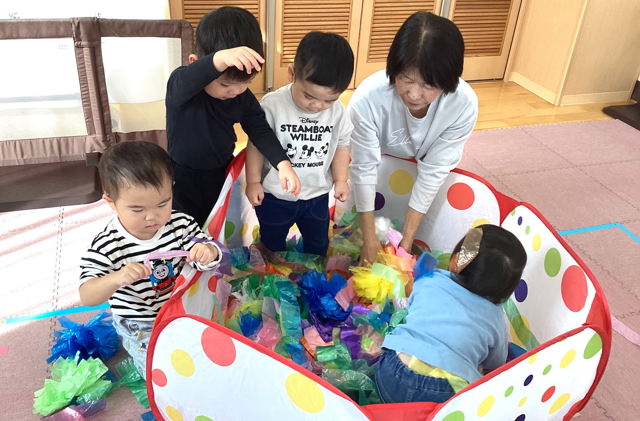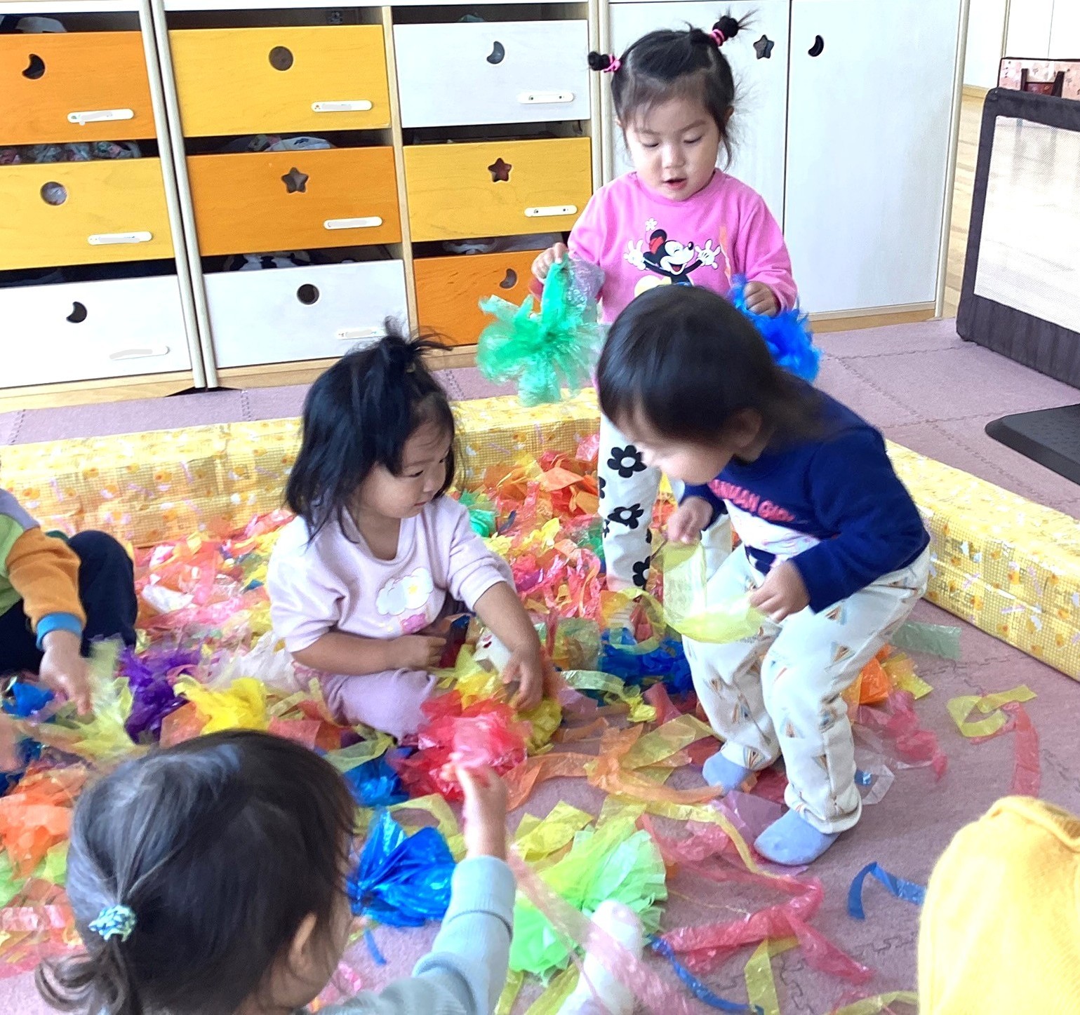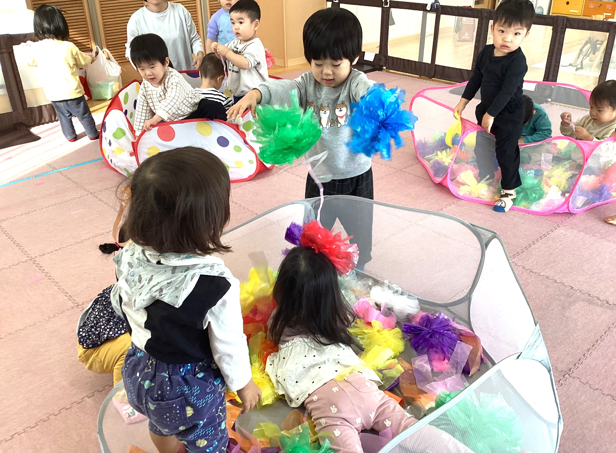 カシャカシャとした感触を味わったり、すずらんテープを「わぁ~✨」と上から降らせて、すずらんテープのシャワーを浴びたり、ビリビリとさくことにも挑戦しました😆🎵