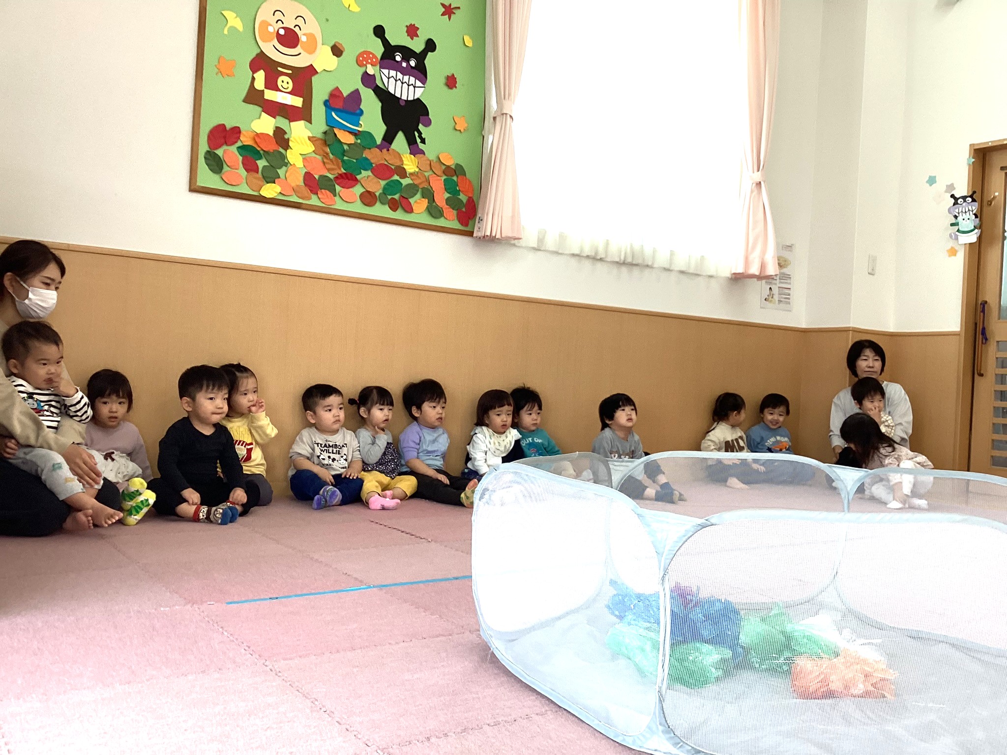 階段や縄のアスレチックをのぼったり、ハイハイでトンネルをくぐったり、桃組の子どもたちにとっては、大冒険です!!😆🎵