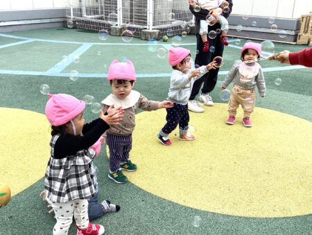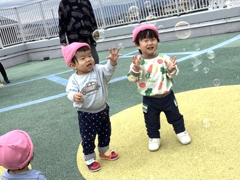 保育士がシャボン玉を飛ばすと、ふわふわ飛んでいくシャボン玉を見つけて手をのばして「わぁぁ~✨」と喜んでいました😄