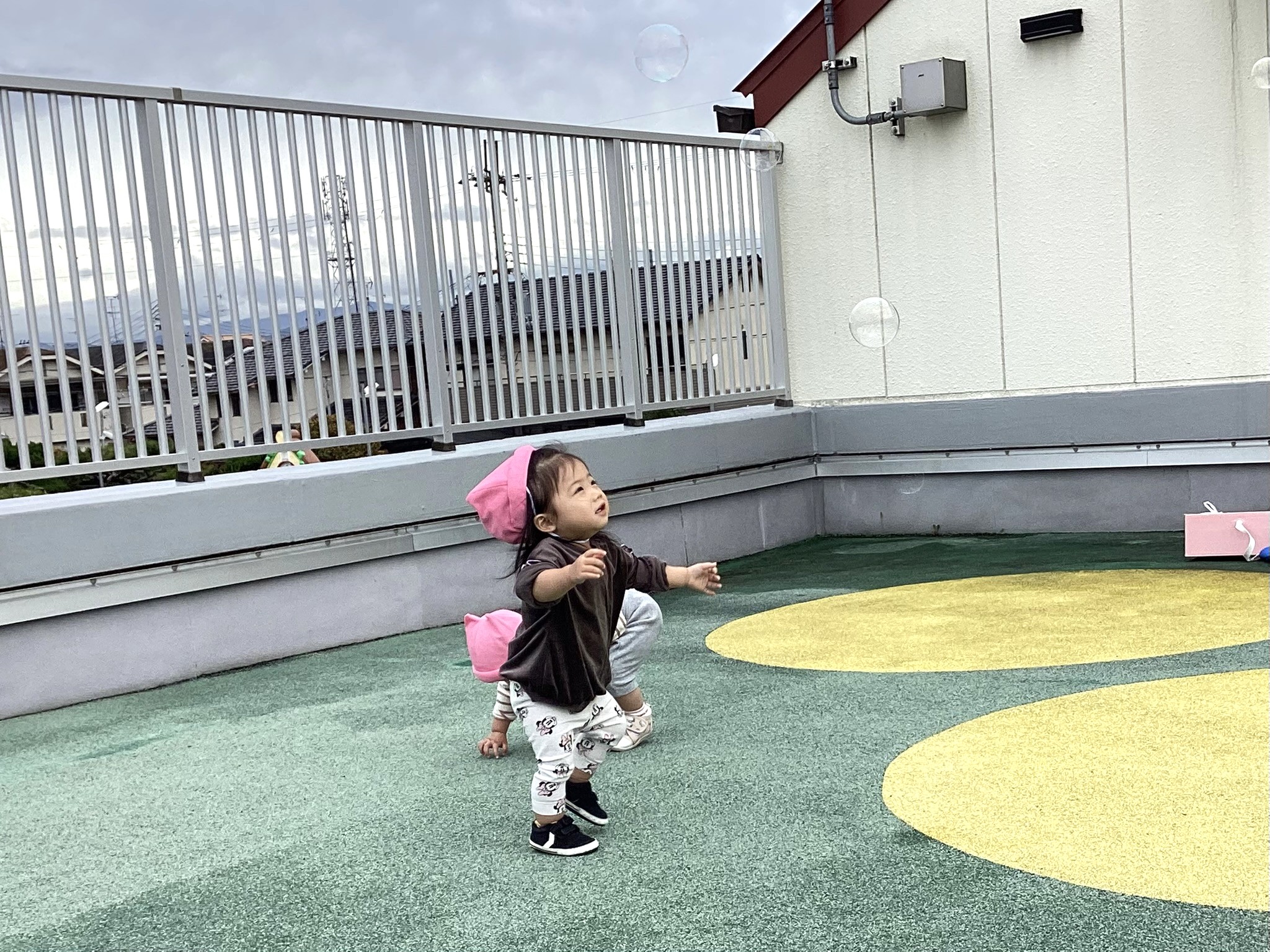 キラキラ光るシャボン玉に興味津々で「シャボン玉をさわってみたい!」とちょこちょこ走って近づく姿がとてもかわいかったです✨🥰