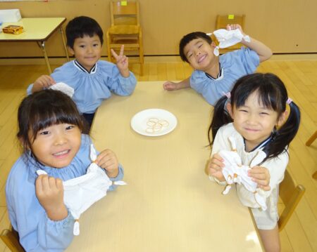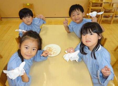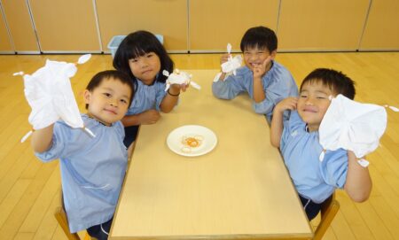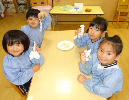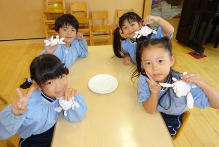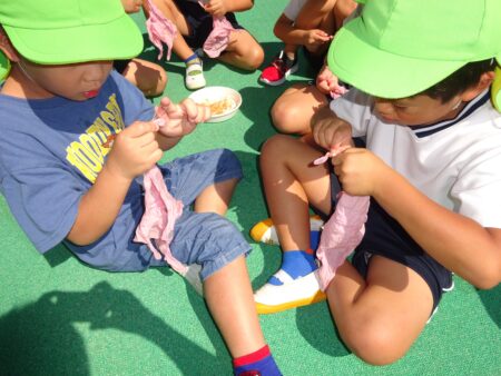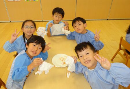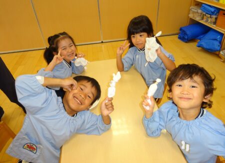 女の子は、自分の髪の毛を結べる子も多く「手伝ってあげる!」と男の子の手助けをしてくれていました🎵