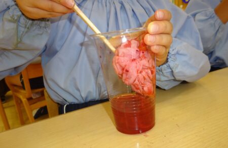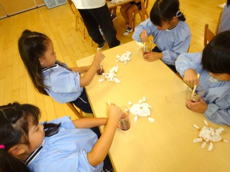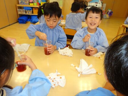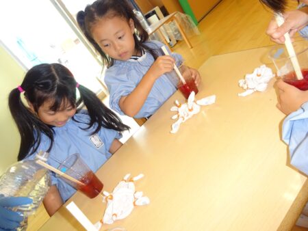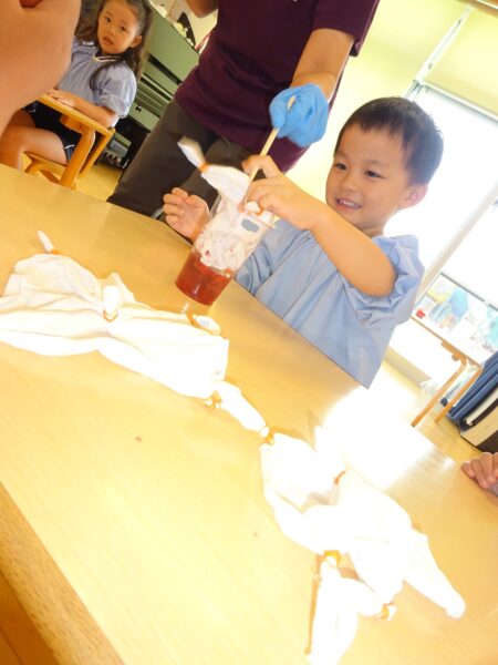 みんなが、がんばって縛った後、アサガオをカップに入れてお箸でつぶします😀