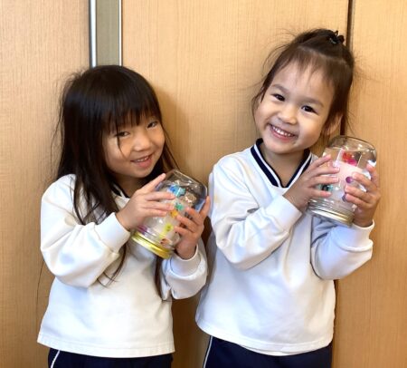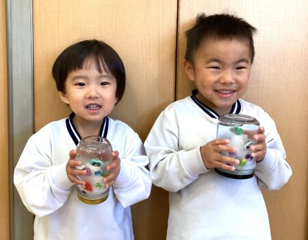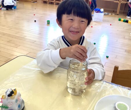 瓶に水と洗濯のりを入れ、「まぜまぜ~」と言いながらクルクル混ぜ、その中に星のラメやキラキラを2種類入れ、かわいいスノードームが完成しました!☃️🎵