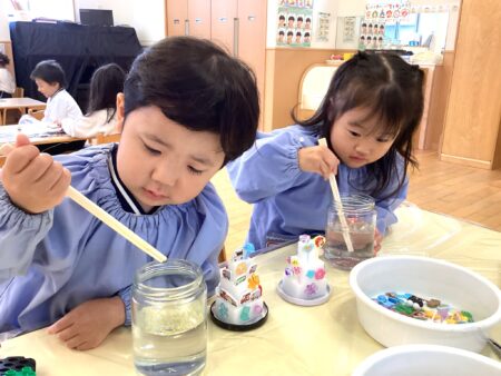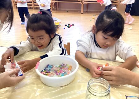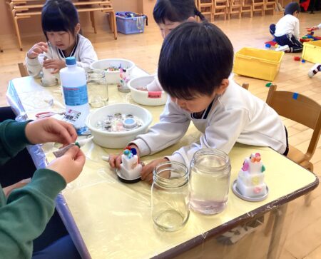 子どもたちは、プリンセスや乗り物、リボンなど「どれにしようかなぁ~」、「くまちゃんのスノードームにしよう!」、「恐竜いっぱいでかっこいい?」と話しながら、好きな飾り付けを選び、楽しんでいました✨